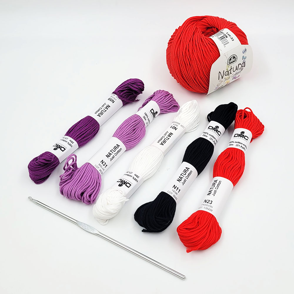 - 1 клубок красной пряжи из 100% хлопка, 50 г, +/- 155 м;